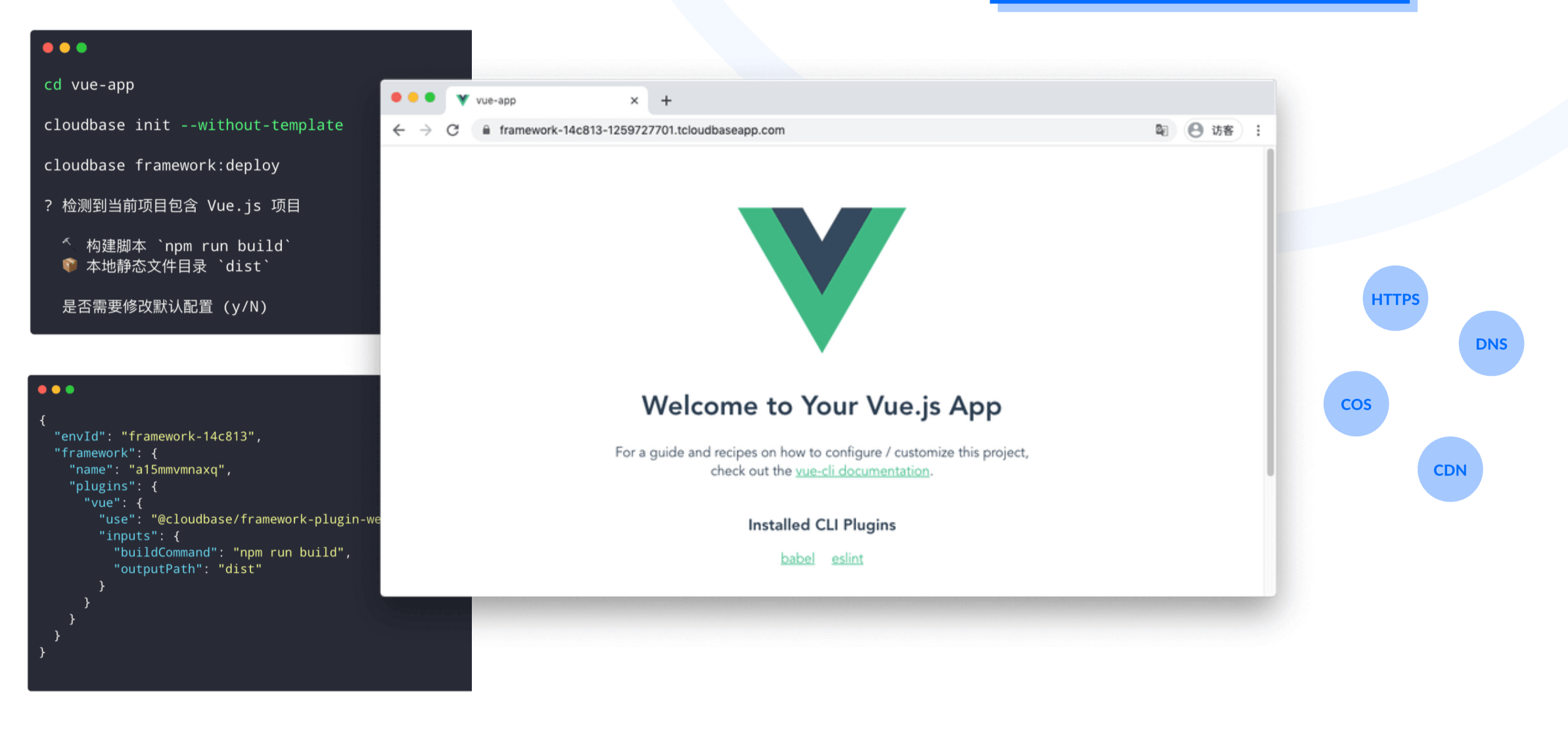 例如,图中所示的基于 Vue CLI 工具创建的项目,在执行 CloudBase Framework 的部署命令时,会自动检测项目框架和语言,交互式确认并保存项目配置,实现应用的一键发布。一条命令实现了应用部署,自动配置 COS 对象存储和 DNS、域名等,自带 HTTPS 安全访问、CDN 访问加速等能力。