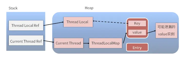 我们重点看一下下面这条链路:Thread Ref → Current Thread → ThreadLocalMap → Entry → Value → 可能泄漏的value实例。
