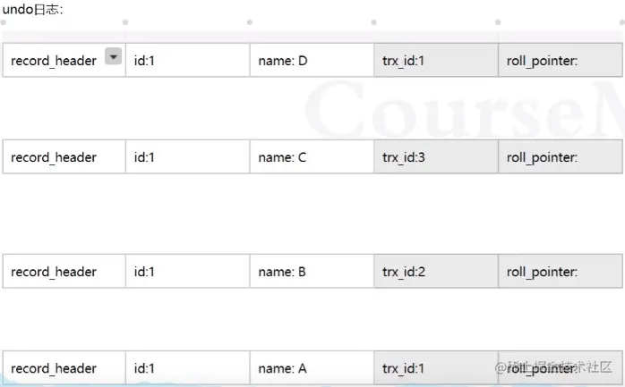 从最新一条记录开始查找:trx_id: 1-->trx_id:3-->trx_id:2-->trx_id:1