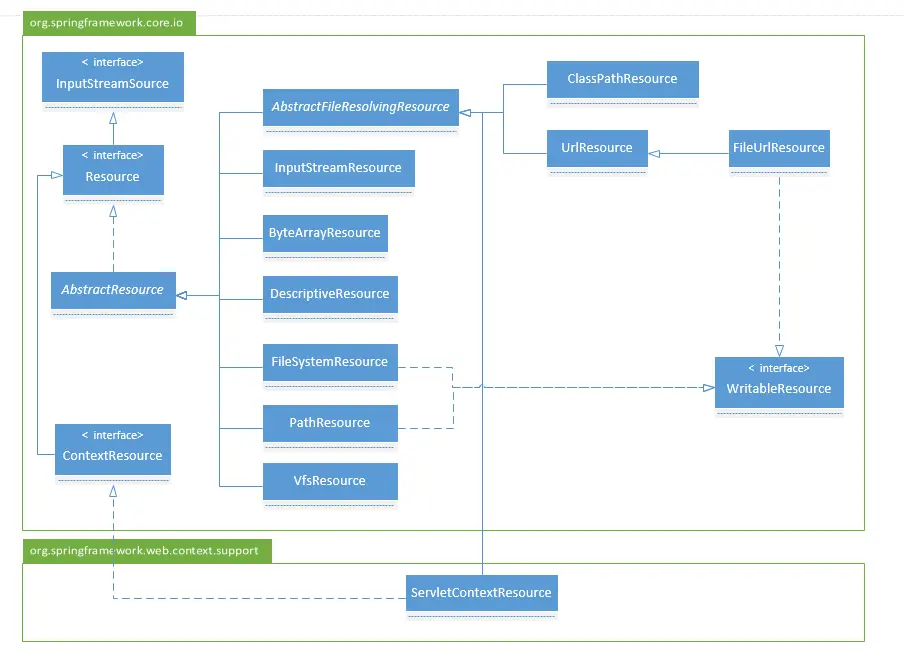从类图可以看到,实现了 WritableResource 接口的类只有 FileUrlResource, FileSystemResource 和 PathResource,这三个类映射的资源都是文件系统的文件,所以可以实现资源的写入操作。