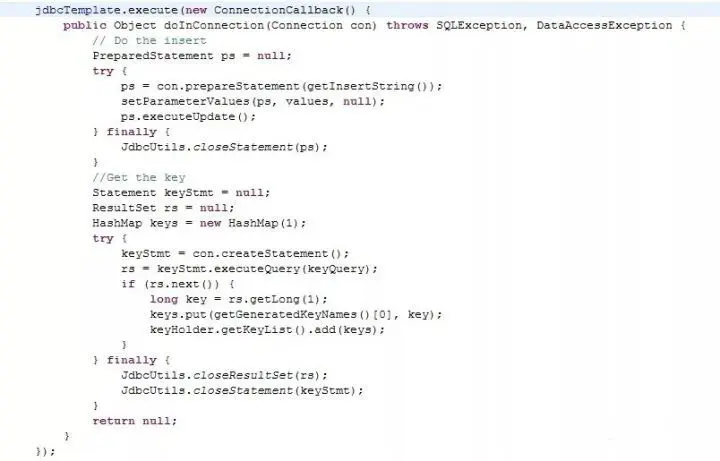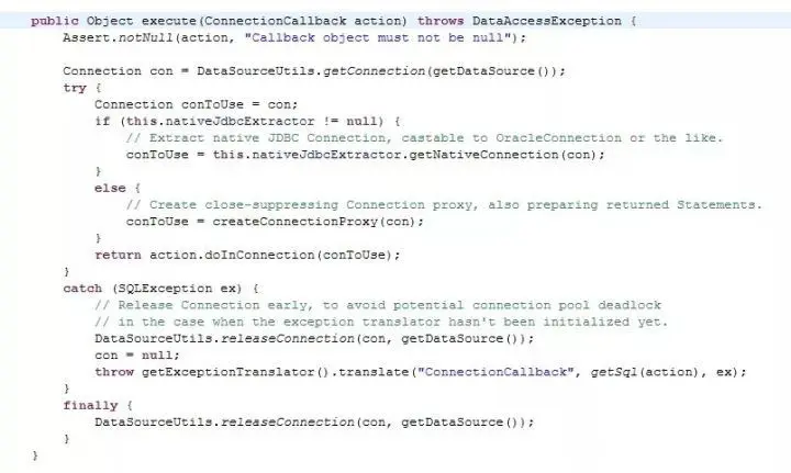 就用回调对象吧。在这个回调对象中定义一个操纵JdbcTemplate中变量的方法,我们去实现