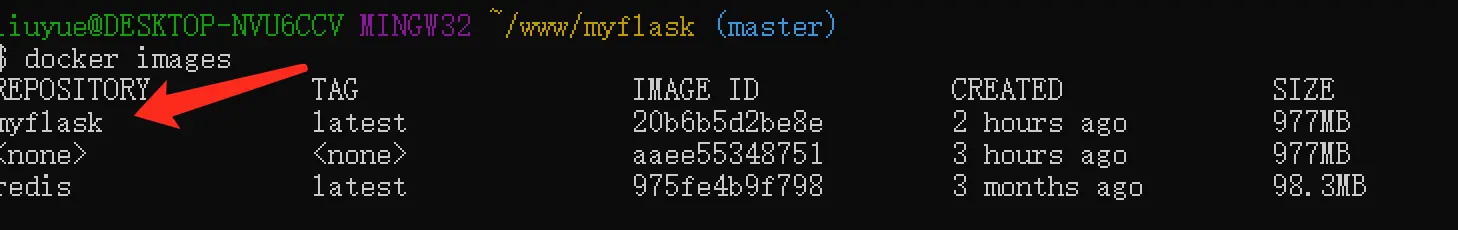 下载结束之后,可以看到myflask这个镜像已经静静躺在镜像库中了,运行
