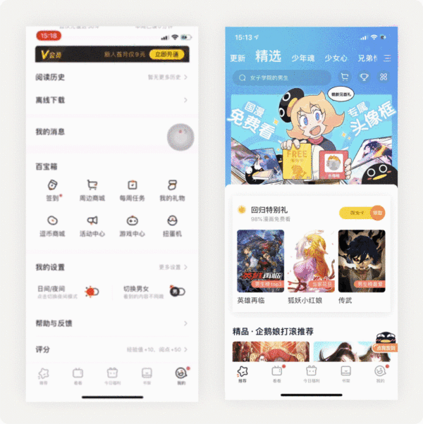 性别切换的同时,根据不同性别,首页的推荐内容也随之更换。