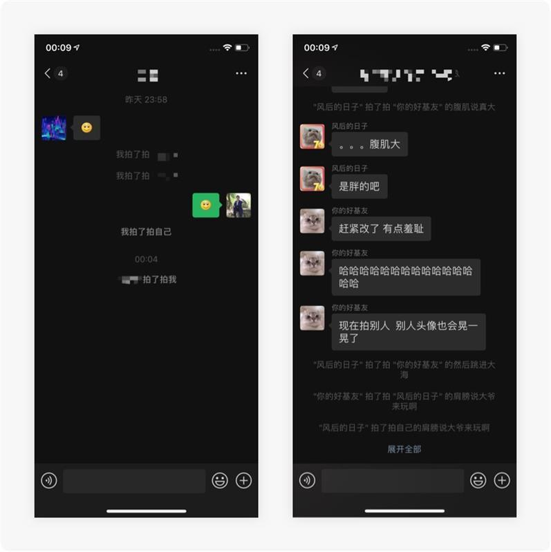 因为「拍一拍」的提醒方式不那么明显,除了聊天界面中的文字记录,没有其他任何形式的提醒,手机不会推送信息,也没有任何形式的提醒,也不会震动。这就避免了传统的「@」和「在吗」的尴尬,可以自然亲切建立起社交的弱关系。