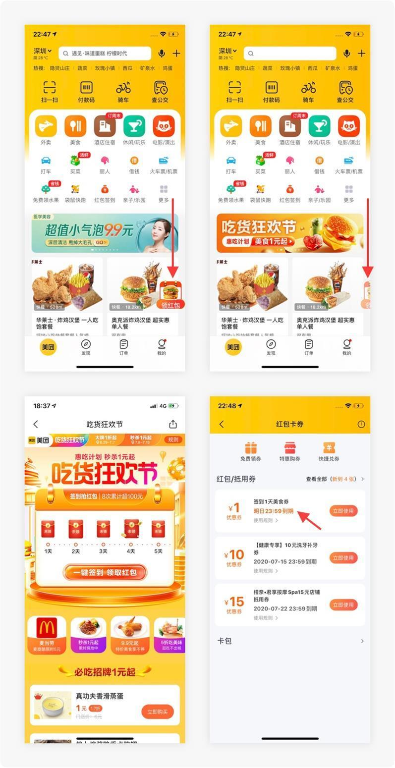 众所周知,人们对动态事务的感知能力要比静态强很多。美团签到功能利用动态图标提醒用户,趣味性的微动效能吸引用户的眼球,也能引导用户进行操作,让签到入口变的突出而不突兀。使用「签到+领红包」的文案更是利用了用户占小便宜的心理,大部分都是选择「让利」去吸引消费者,这种方式短期内也最有效,增加了用户的点击欲望,提升签到的完成率。