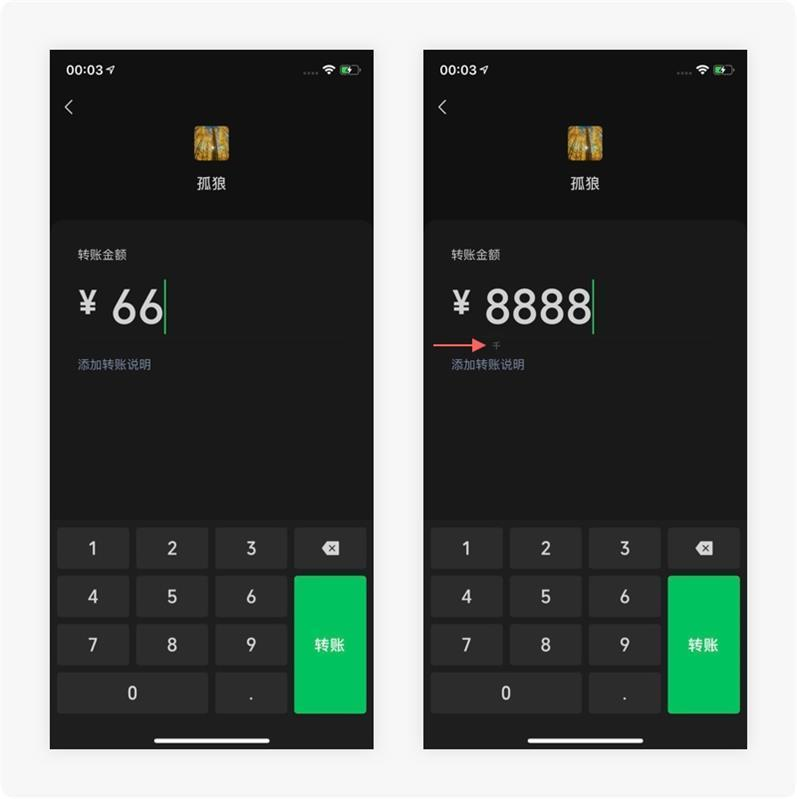 使用微信给好友转账时,金额超过4位数就在数字下方增加单位提示,如:千、万、十万……