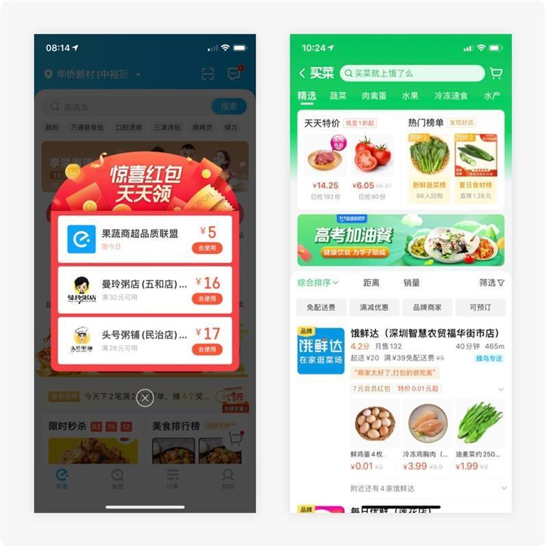 每日首次进入饿了么,会弹出「惊喜红包天天领」的弹窗,点击对应红包的「去使用」按钮即可进入对应的商品/店铺列表,达到条件(如:商品类型、满减)直接作为现金抵扣使用。