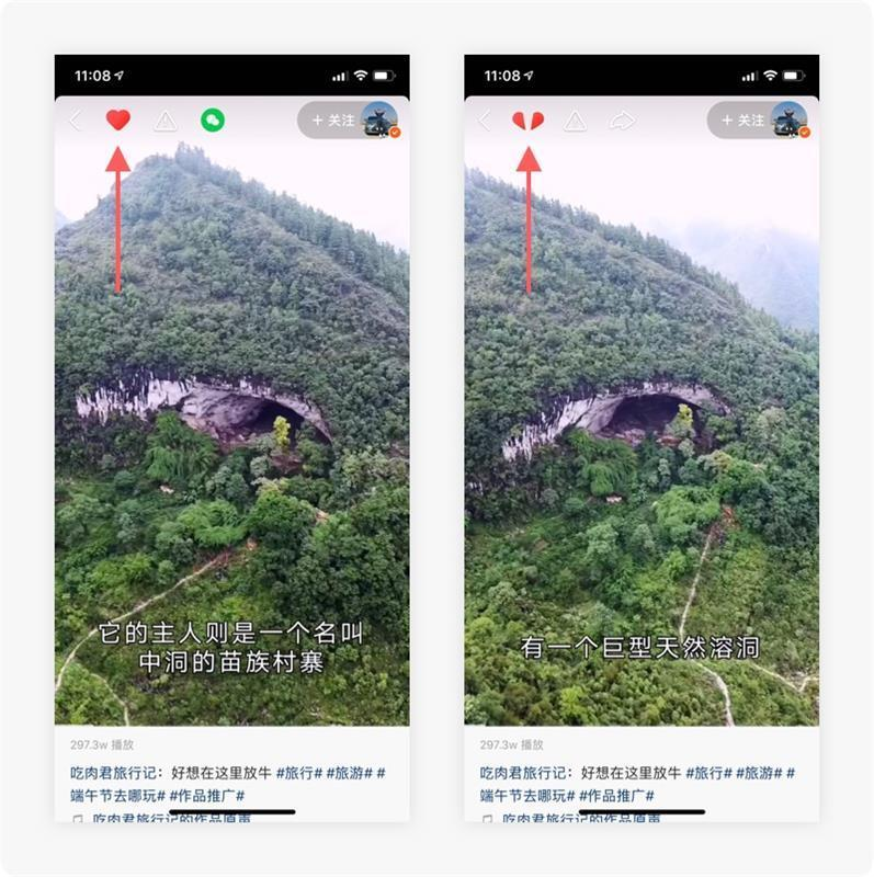 在快手APP看到自己喜欢的小视频,可点击左上角的心形图标点赞,「取消点赞」图标以动画形式从裂开到破碎。