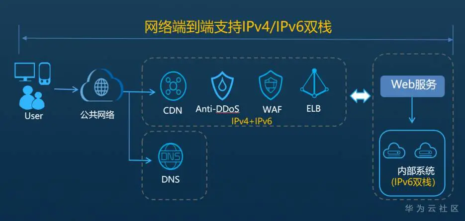 IPv6-双栈的原理如上图所示:前端接入网络改造成能够同时支持IPv4和IPv6终端访问的双栈网络,企业后端应用系统也改造成双栈,网络端到端支持IPv4和IPv6的业务接入。