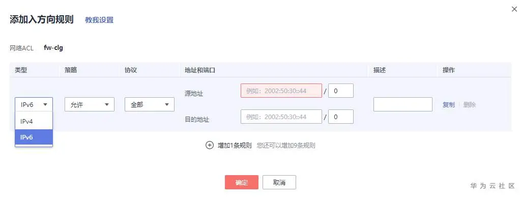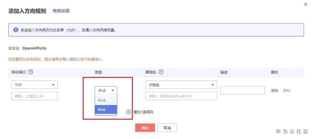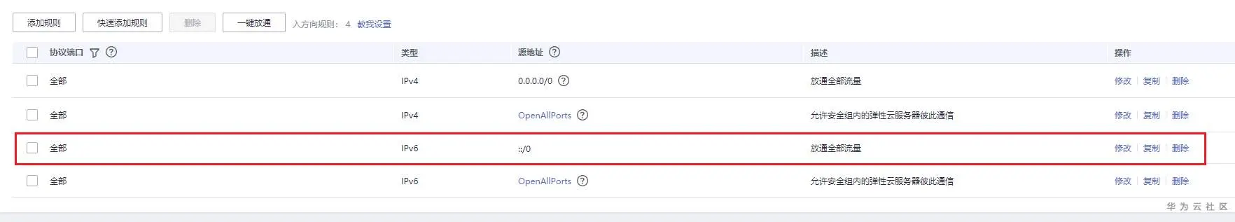 IPv6代表所有IP地址的IP:::/0(冒号为英文冒号),对应IPv4的0.0.0.0/0。
