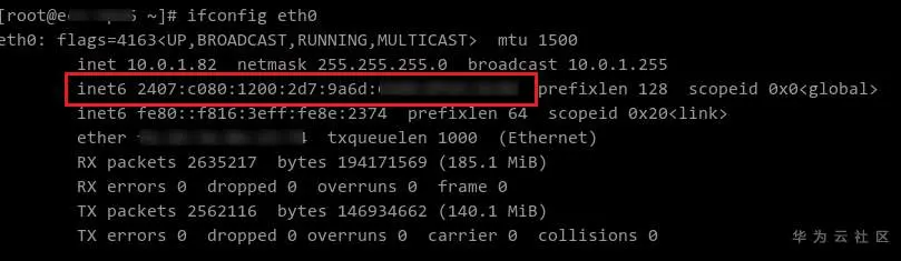 - 执行ifconfig eth0,如果能看到与console网卡界面一致IPv6地址,即说明配置成功:
