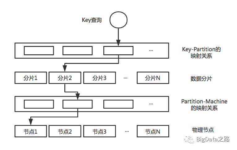 在上述模型中,数据按照key-Partition的映射关系进行存储在不同分片中,我们可以看到原本的路由层拆分为Key-Partition的路由和Partition-Machine的路由。当查询一个Key的值时,首先通过Key和分片的映射关系,定位到Key处于哪个分片中,然后通过Partition-Machine的映射关系,定位到分片处于哪个物理节点中。此时我们不难发现Host:Partition是多对一的关系,Partition对Key来说也是多对一的关系。