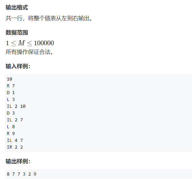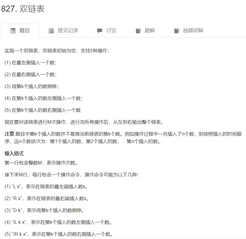 这道题的题意是要我们实现一个双链表,双链表支持五个操作: (1)在链表的第一个节点之前(最左侧)插入一个数 (2)在链表的最后一个节点之后(最右侧)插入一个数 (3)删除第k个插入的数 (4)在第k个插入的数左侧插入一个数 (5)在第k个插入的数右侧插入一个数