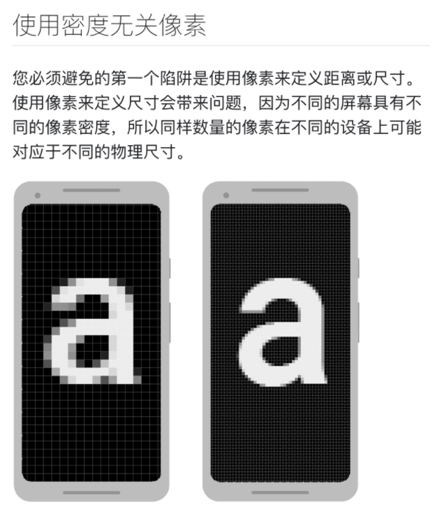 例如,考虑图 1 中的两部设备。如果将某个视图定义为“100px”宽,那么它在左侧设备上看起来要大得多。因此,您必须改用“100dp”来确保它在两个屏幕上看起来大小相同。