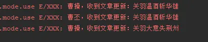 最后我们来测试一下。我们定义了3个人物观察者:zhangObserver、guanObserver、liuObserver;定义了一个公众号的被观察者:articleObservable。并调用了addObserver()方法使得观察者订阅被观察者,这里我们订阅了2个,最后调用pushArticle()方法发表推文。运行结果如下。