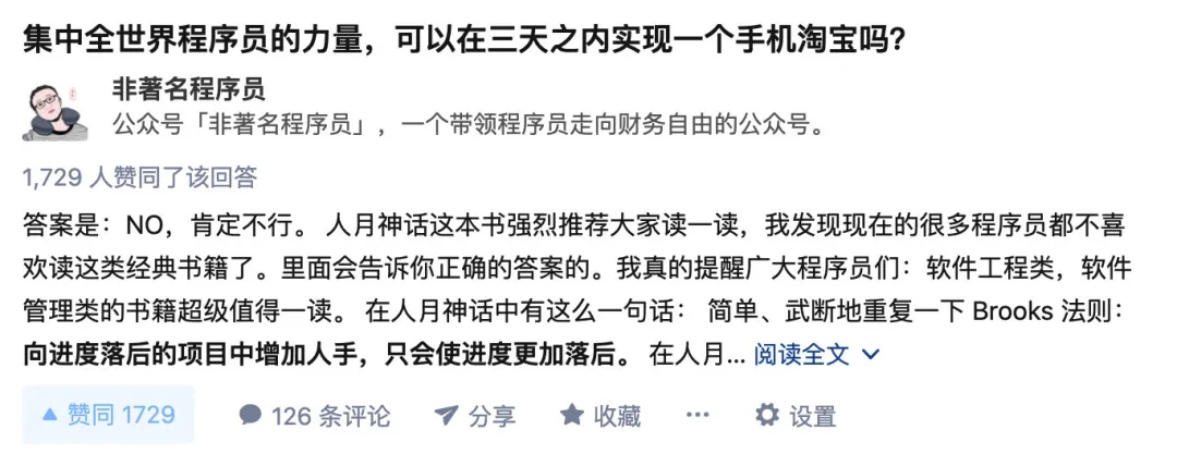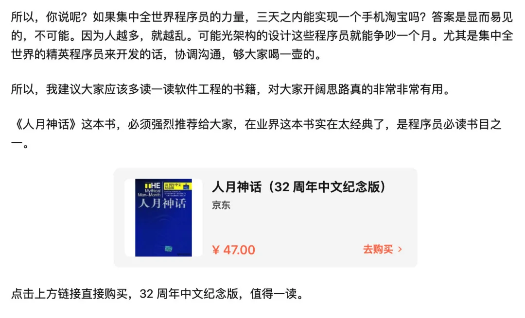 你看,我在这个问题下面想到了一本书《人月神话》,那么我写的答案都是《人月神话》里面的观点,所以在回答完之后,自然而然的就会推荐大家读一下这本书,那么就放了《人月神话》的购买链接。