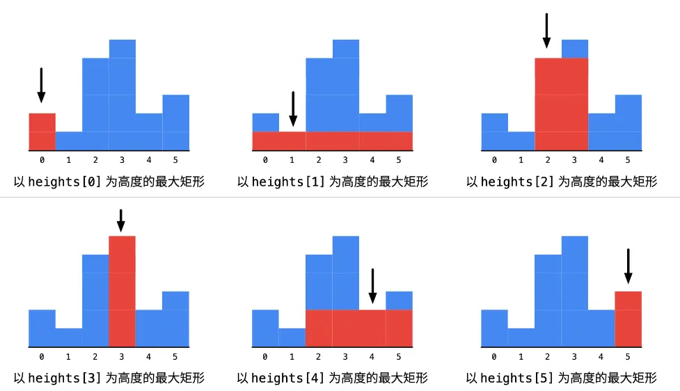 按顺序遍历数组高度,例如以[2, 1, 5, 6, 2, 3]为例。