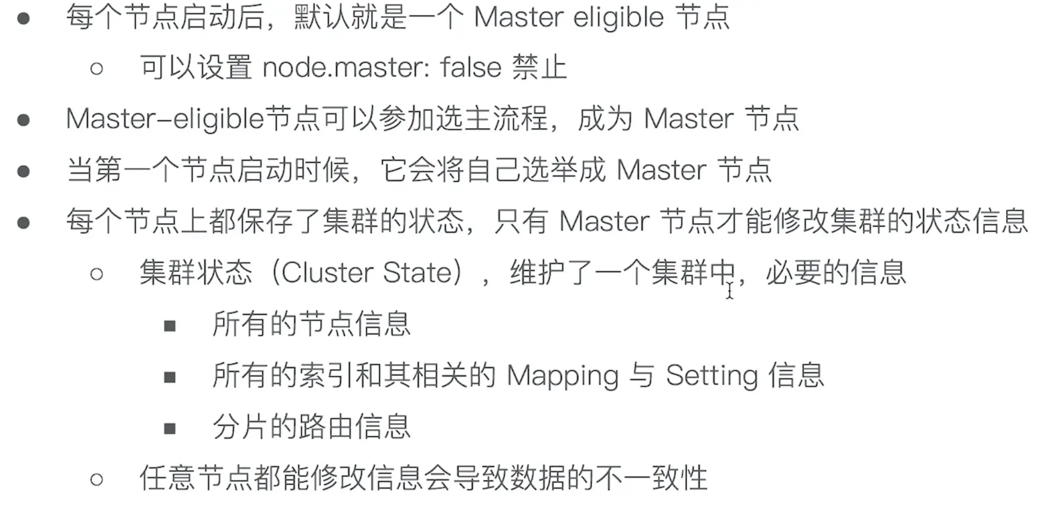 在这么多节点中,会有一个主节点Master Node,他的主要功能就是维护索引元数据和切断主副分片,比如一个主分片挂了,会切换该分片的副分片进行调用,其实它主要就是保证了一个公共信息的全局唯一性,避免多个节点修改造成数据的不统一,比如索引的结构Mappping信息,分片的路由信息等。