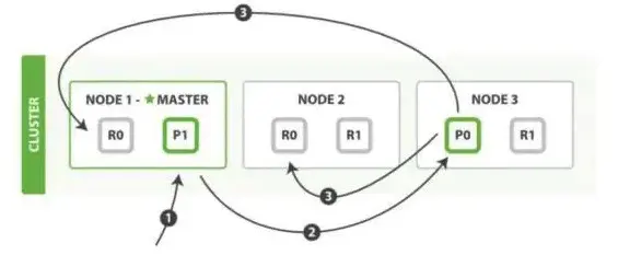 _id来哈希一下(这个哈希函数可以指定),确定主分片到底在哪个节点上,比如哈希完之后,确定需要存储到节点3的主分片P0上,那么就会把请求转发到节点3上。 - 节点3接收到请求之后,会在分片上写入,写成功后同时会把请求转发到在节点2上的副分片上进行数据同步,在收到节点2的副分片写入成功的回复后,会回复协调节点1,写入成功,然后节点1返回给客户端成功。