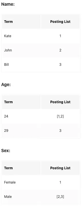 上面这三条doc,插入时会为每个filed也就是每个字段创建倒排索引。
