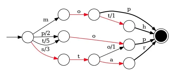 比如现在举一个例子,我们现在有一组词需要构建查询mop、moth、pop、star、stop、top这些都是term的前缀,然后在创建一个数组把这个词依次按照这个顺序放进去。然后构建FST,每一个单词的权重就是他们在数组中的位置这里放出来一个构建的网站可以构建看一下FST构建网站