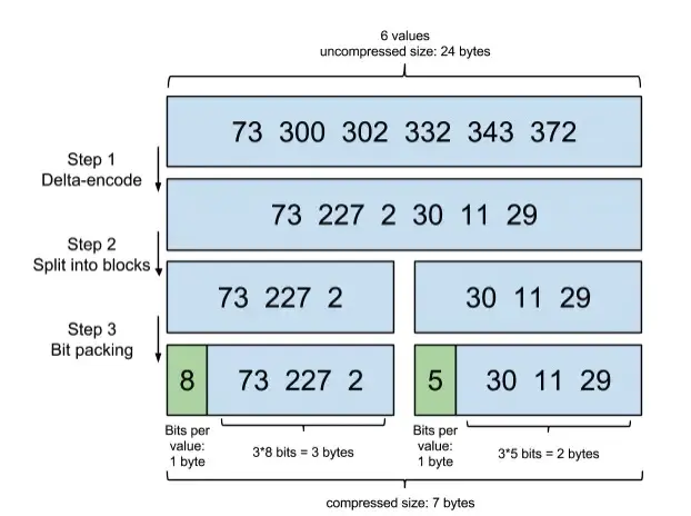 比如现在有六个posting list的数值,上面图中,首先第一步,这六个数值,可以以73为基数,逐步递增,通过增量把大数变成小数,后一个数值都是前面数值只和再加上本数值,比如302=73+227+2。通过这种方式把大的数变成小数,为什么要这么干,因为原始的六个数值其实每个数值int占4个字节,变小数了之后,比如30这个数值,我用5个bits就能表示,因为5个bits的二进制能表示的范围是0-31。通过这种精打细算的计算方式,可以把数值分组,找到最大的数字,以它所占的最小的bits能够表示的范围作为压缩的基准,比如图示中,227需要用8个bit表示,那这一组的三个数字就都是8bits,这样算出来用3个byte就能表示三个数。最后,原始的六个数字需要用24字节才能表示,现在压缩成7个字节就能表示。