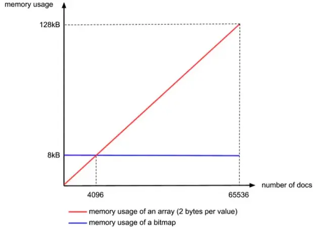 bitmap的缺点就是,文档越多,你这个存储的空间就会越来越大,是线性增长的。下面看看Roaring bitmaps是怎么做的。