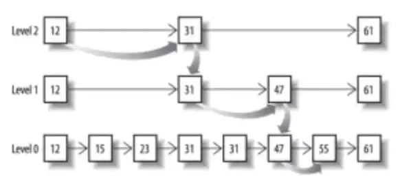 将一个有序链表level0,挑出其中几个元素到level1及level2,每个level越往上,选出来的指针元素越少,查找时依次从高level往低查找,比如55,先找到level2的31,再找到level1的47,最后找到55,一共3次查找,查找效率和2叉树的效率相当,但也是用了一定的空间冗余来换取的。
