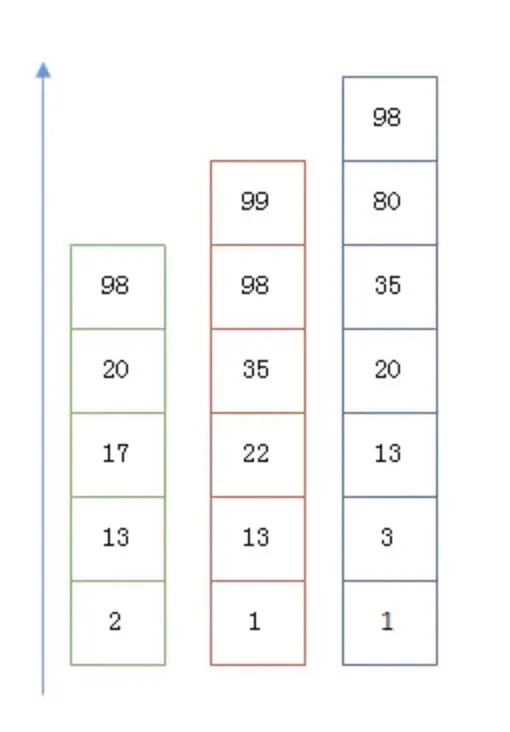 假设有下面三个posting list需要联合索引,其实他可能是一个filed中存储的三个term查询出来的三个posting list,也可以是不同filed中相同的term出来的,总之就是查出来三个posting list需要合并: