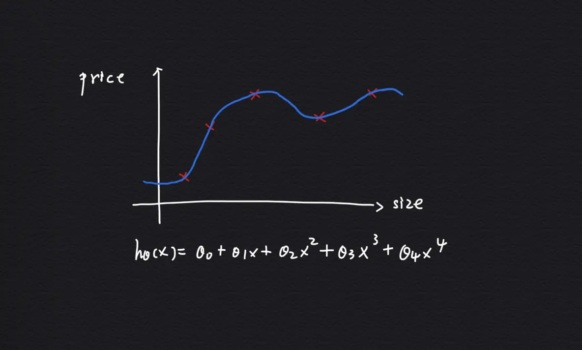 但是当我们继续增大模型的多项式次数后,会发现训练集误差继续减少,但是交叉验证误差却反而增大了,这是因为我们选择的多项式次数太高,模型在交叉验证集上产生了过拟合,也即方差太大。