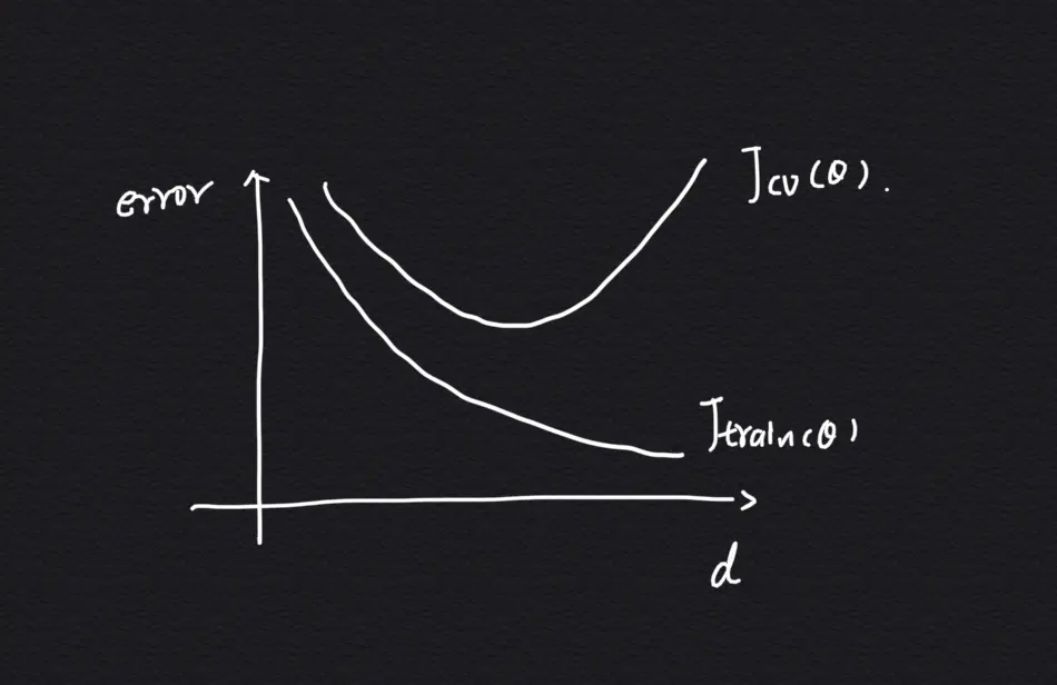 通过前面拆分的训练集合交叉验证集,我们可以画出一个模型的多项式次数 - 代价函数误差的曲线,以此通过曲线来帮助我们分析当前的模型是欠拟合还是过拟合,比如下面的曲线: