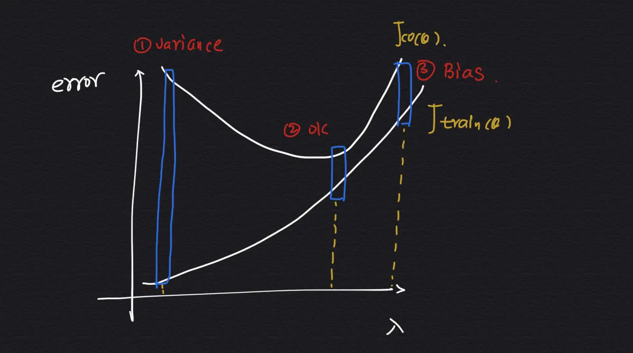 当正则化系数很大,模型在训练集上都不能很好地拟合数据(欠拟合),更别说在未知上交叉验证集上测试了,所以这两者的误差都很大。