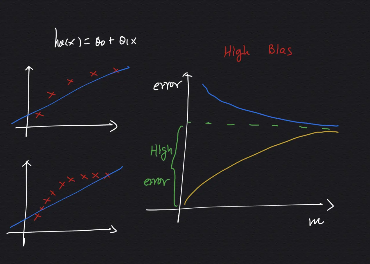 当模型欠拟合时,比如多项式次数太少(特征太少了),不管把样本数量增大到多少,训练集误差和交叉验证集误差都不会下降很多,这种情况就说明我们的模型存在高偏差问题,也就是欠拟合了: