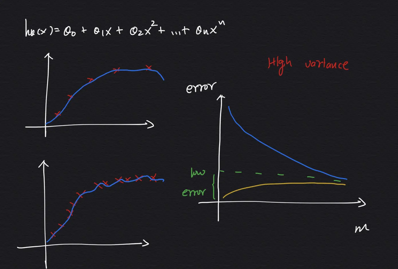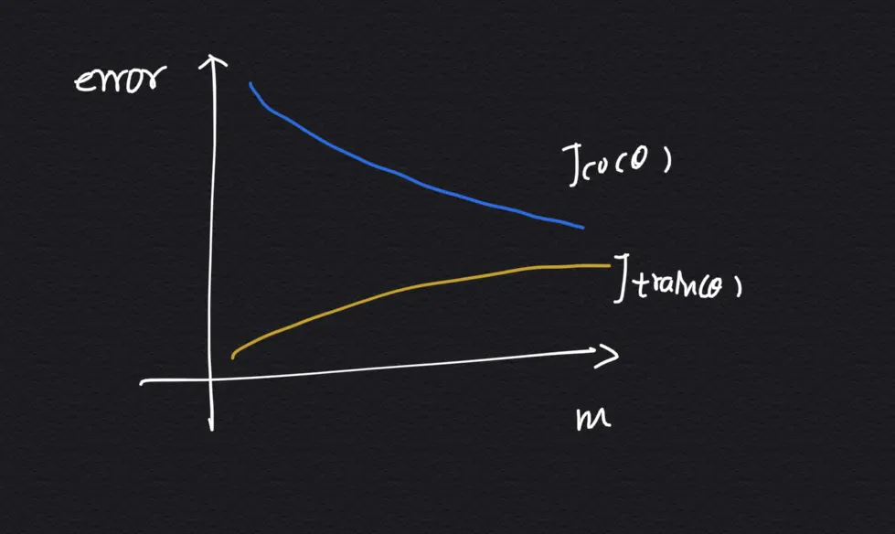 现在假设我们有一个非常高次的多项式模型(特征很多),并且正则化系数很小时,如果训练样本数很少,那么在训练集上会过拟合,导致在交叉验证集上误差较大(过拟合不能很好的适应新样本),而当增加样本数量的时候,因为我们模型有足够多的特征,所以不会轻易的过拟合,这样随着数量增多,训练集和交叉验证集的误差都会减小: