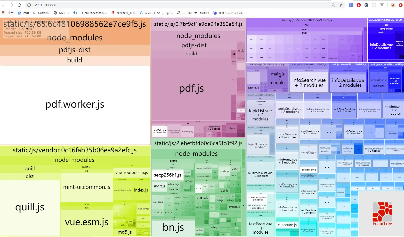 我们应该先从红色和橙色块中分析大的依赖包如何处理,以及分析哪些包并没有使用却在项目中引用的情况,我们应该删除这些引用。现在看到的情况已经是我删除过moment.js的情况,分析图中我发现