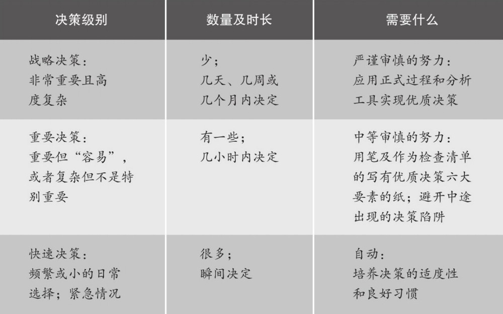 3)如何梳理决策框架:可确定的(无需决策、供决策的限制条件)、关注的部分(决策核心内容)、可往后放或单独做的