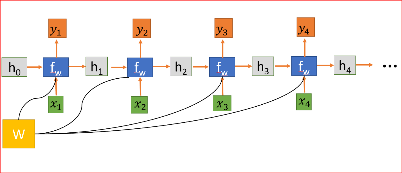 在RNN中,我们共享权重并将输出反馈给循环输入,这种循环公式有助于处理序列数据。