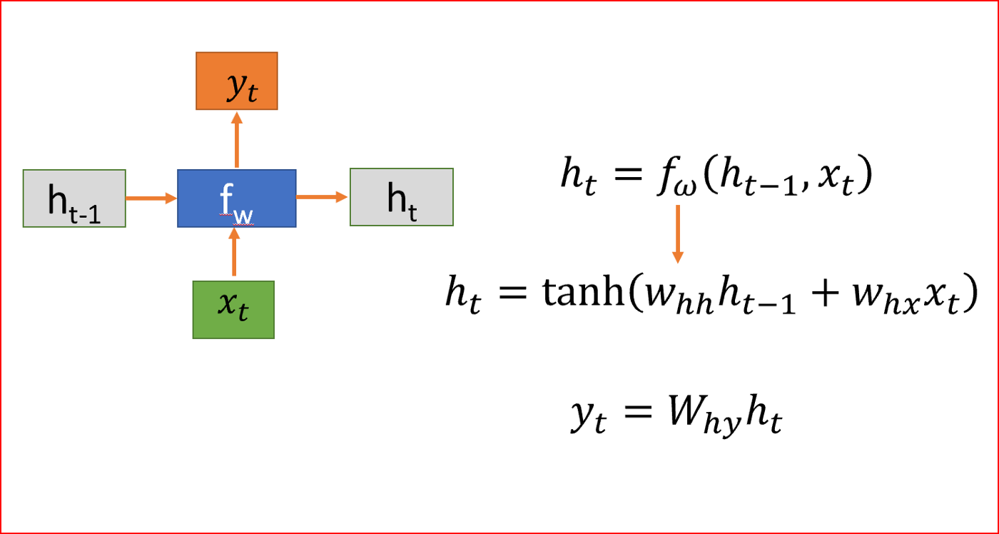 当我们在处理序列数据时,RNN在时间步t上取一个输入x。RNN在时间步t-1上取隐藏状态值来计算时间步t上的隐藏状态h并应用tanh激活函数。我们使用tanh或ReLU来表示输出和时间t的非线性关系。