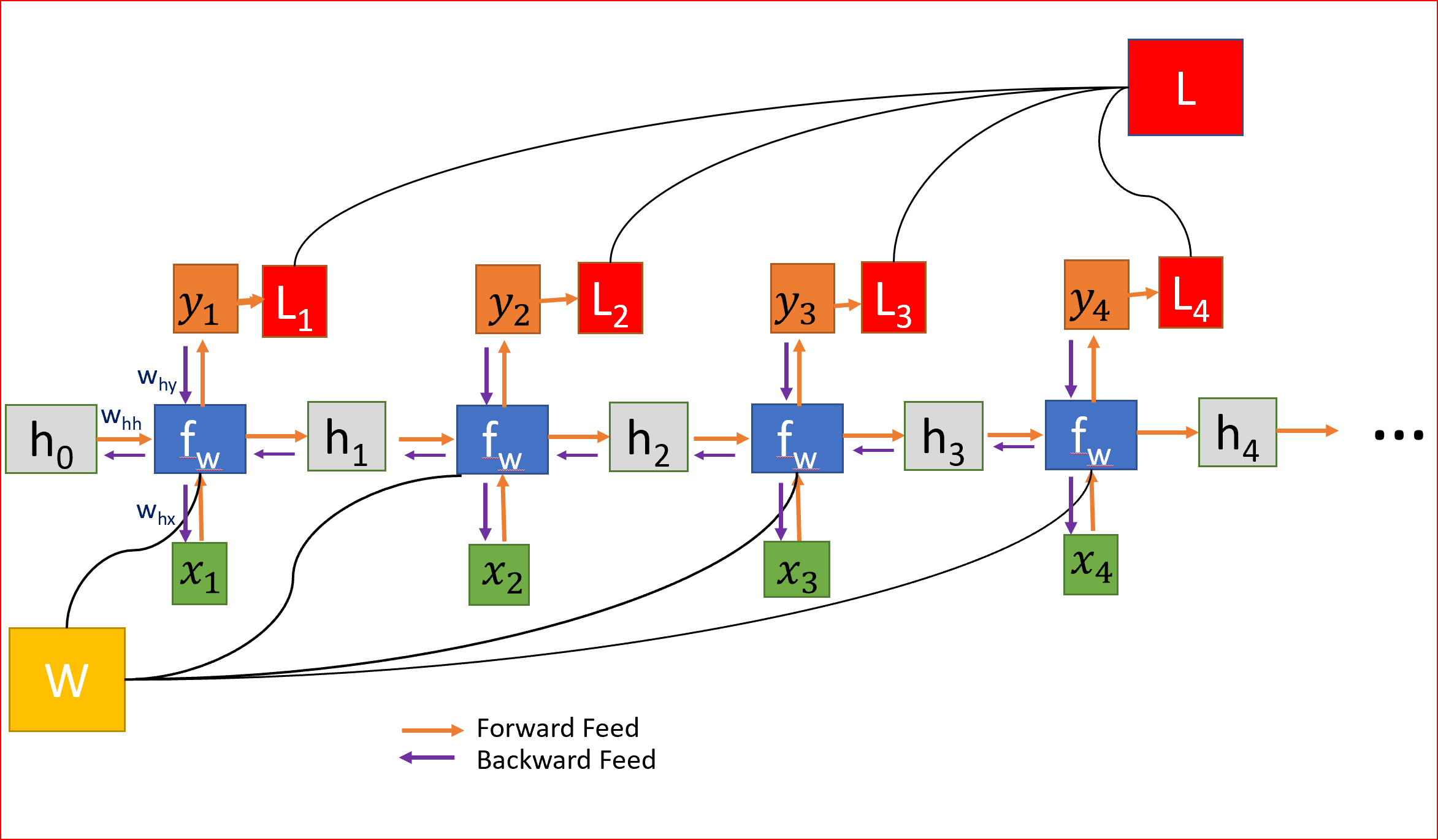 为了减少损失,我们使用反向传播,但与传统的神经网络不同,RNN在多个层次上共享权重,换句话说,它在所有时间步骤上共享权重。这样,每一步的误差梯度也取决于前一步的损失。