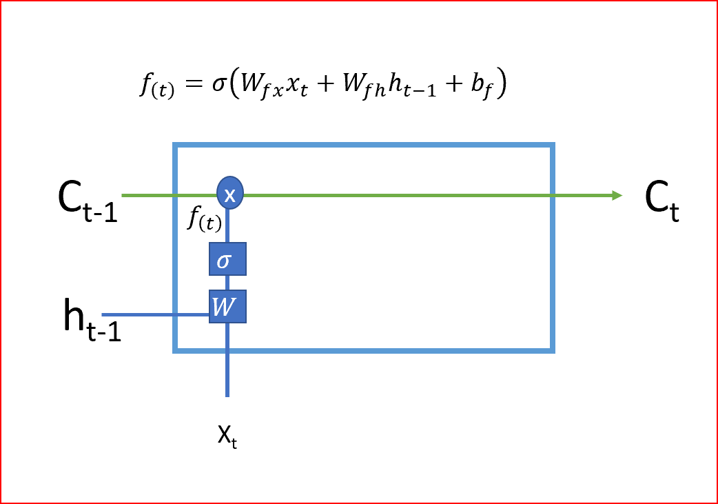 - LSTM的第一步是决定我们是需要记住还是忘记单元的状态。遗忘门使用Sigmoid激活函数,输出值为0或1。遗忘门的输出1告诉我们要保留该值,值0告诉我们要忘记该值。