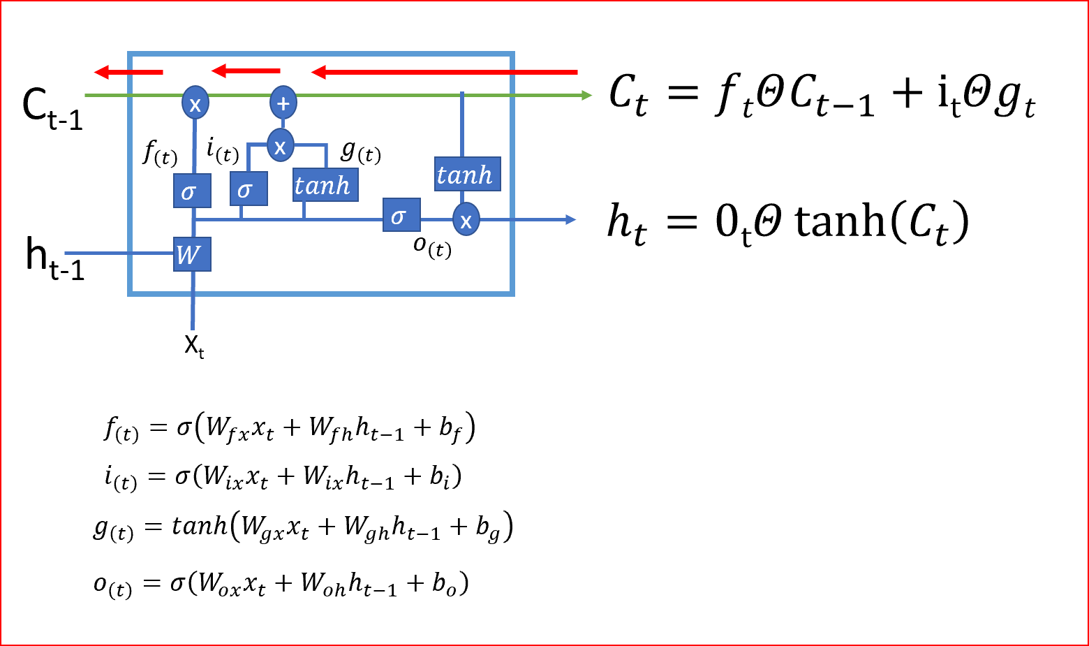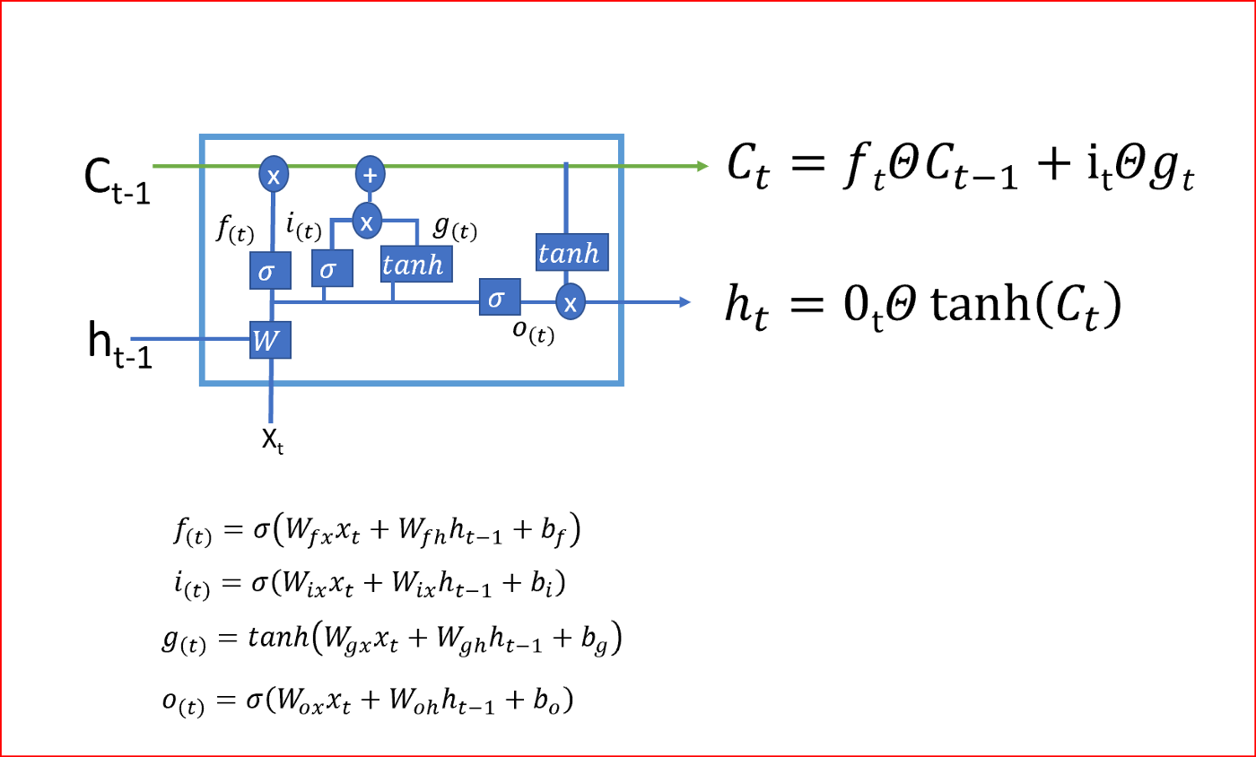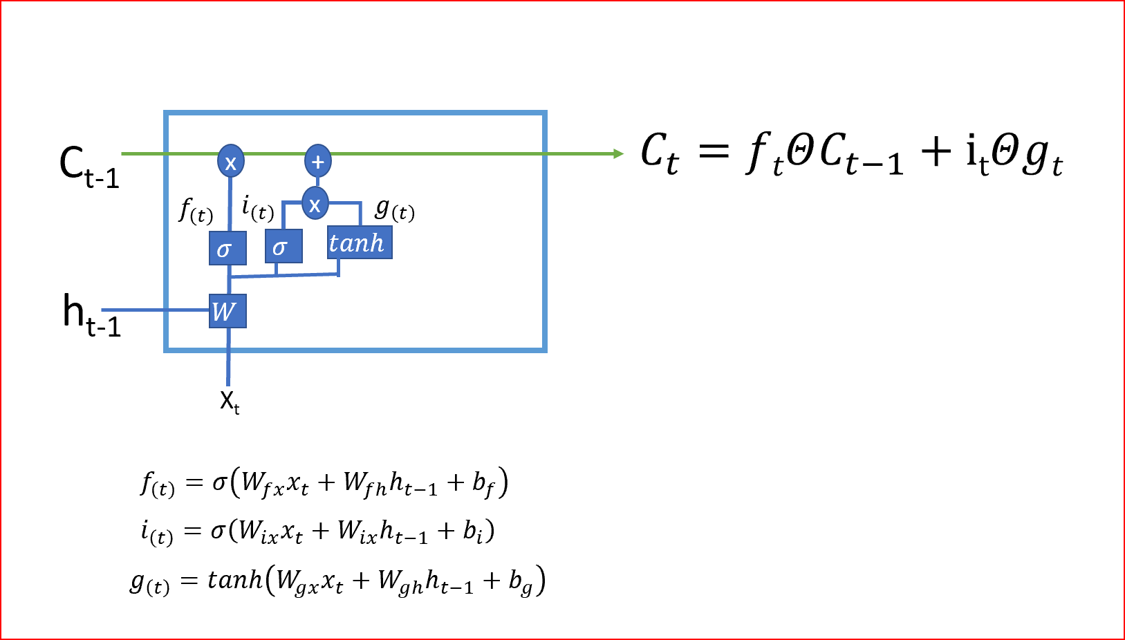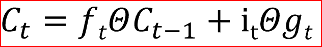 单元状态是单元的内部存储器,它将先前的单元状态乘以遗忘门,然后将新计算的隐藏状态(g)乘以输入门i的输出。
