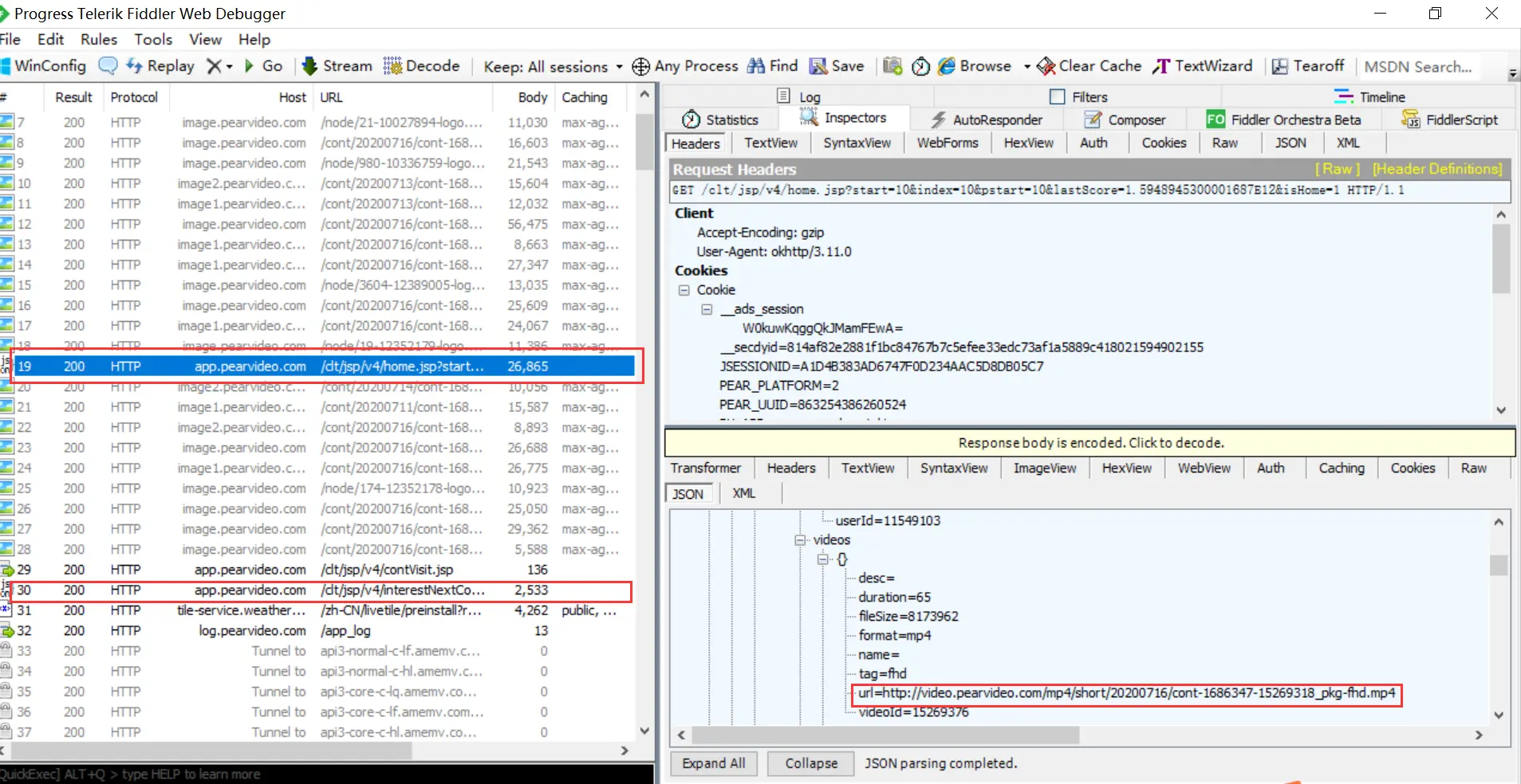 四、Fiddler 抓取梨视频 APP 信息