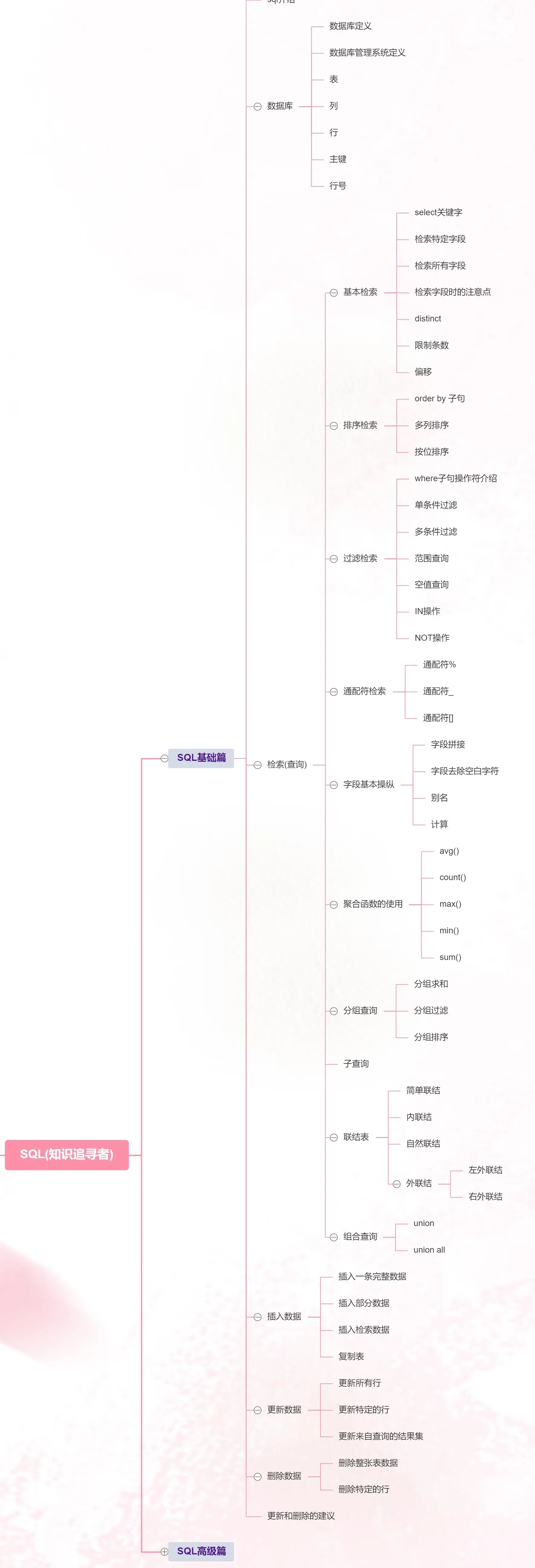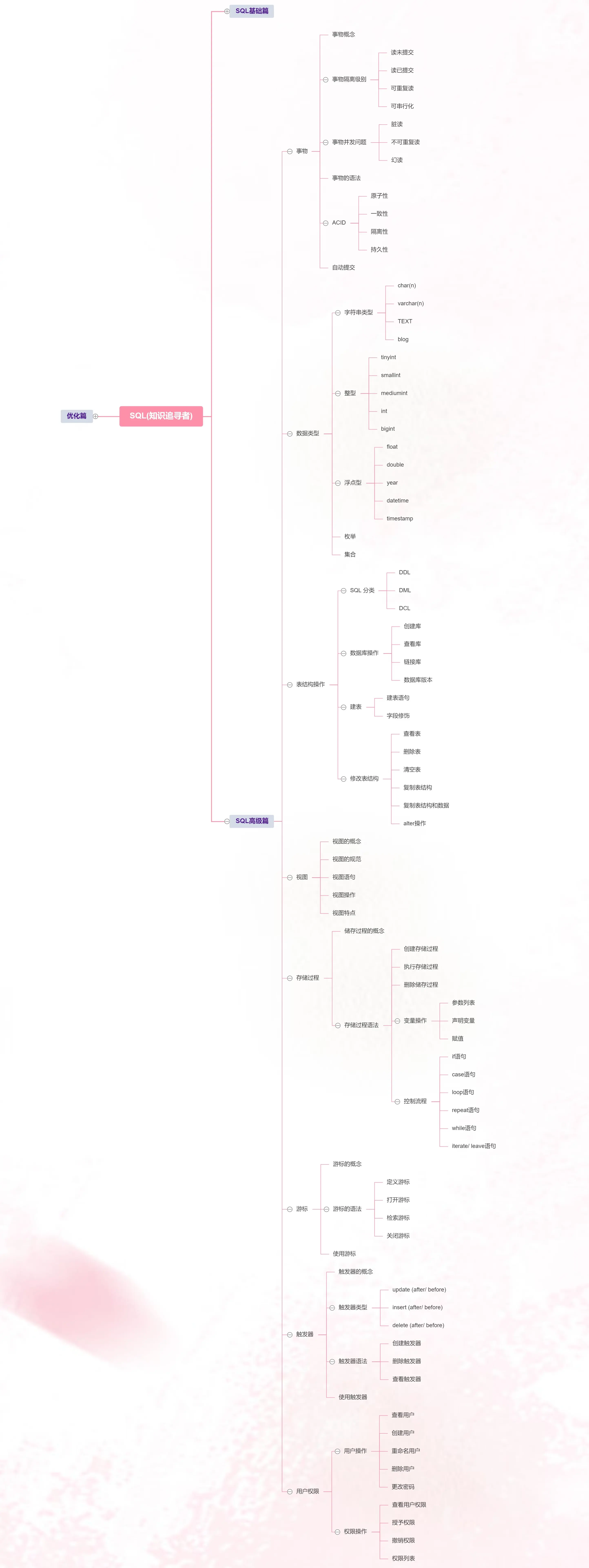 读者可以看下思维导图,看下第一版的MYSQL体系知识,如果感觉有用你就关注公众号知识追寻者,后台回复 拍拍知识追寻者,即可领取;