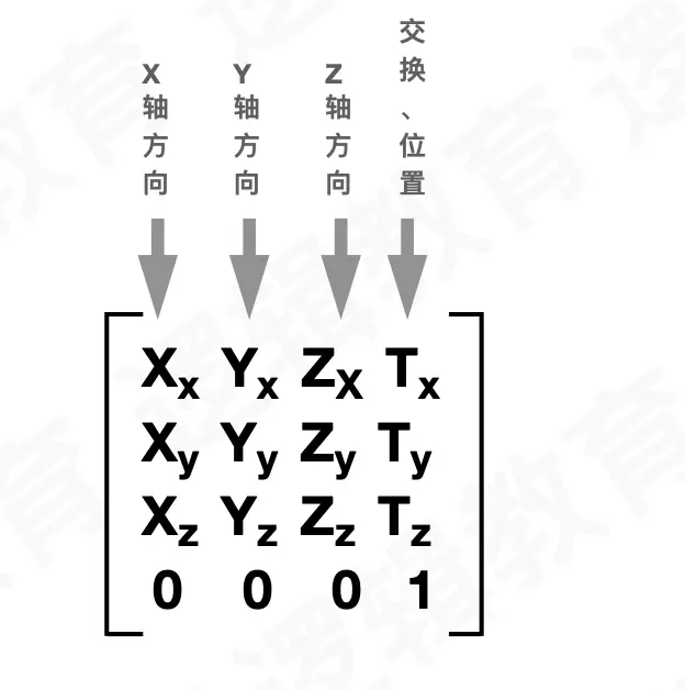 一个4*4矩阵是如何在3D空间中表示一个位置和⽅向的 列向量进行了特别的标注:矩阵的最后⼀行都为0,只有最后⼀个元素为1