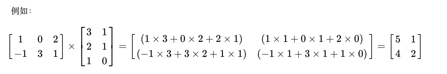 两个矩阵的乘法仅当第一个矩阵A的列数和另一个矩阵B的行数相等时才能定义。如A是m×n矩阵和B是n×p矩阵,它们的乘积C是一个m×p矩阵.