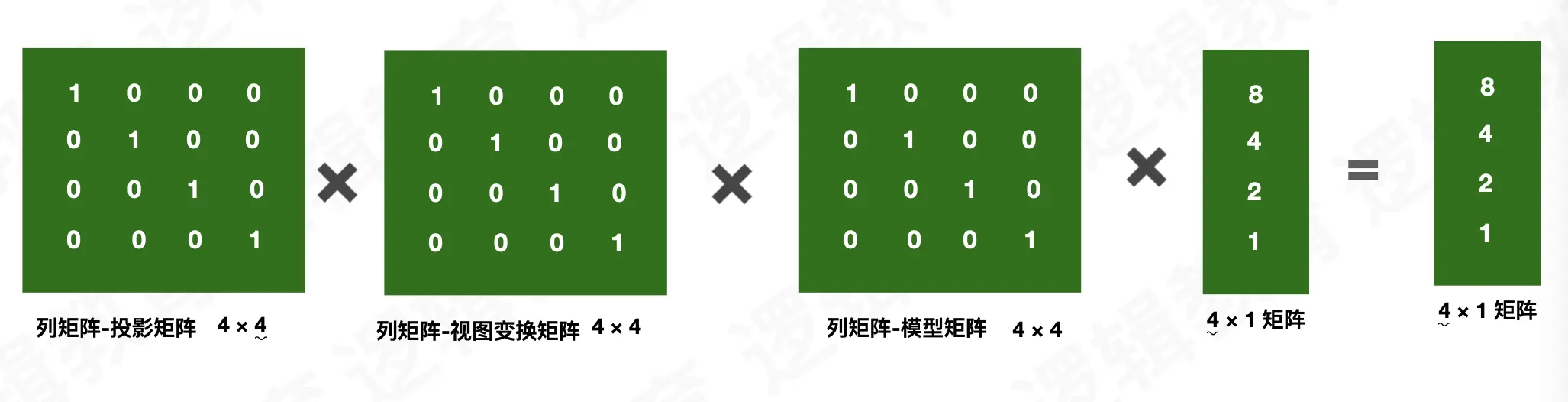 变换顶点向量 = 投影矩阵 ✖ 视图变换矩阵 ✖ 模型矩阵 ✖ 顶点