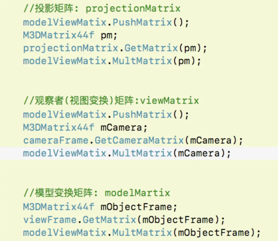 //矩阵乘以矩阵堆栈顶部的矩阵。相乘结果存储在堆栈的顶部 void GLMatrixStack::MultMatrix(GLFrame &frame);