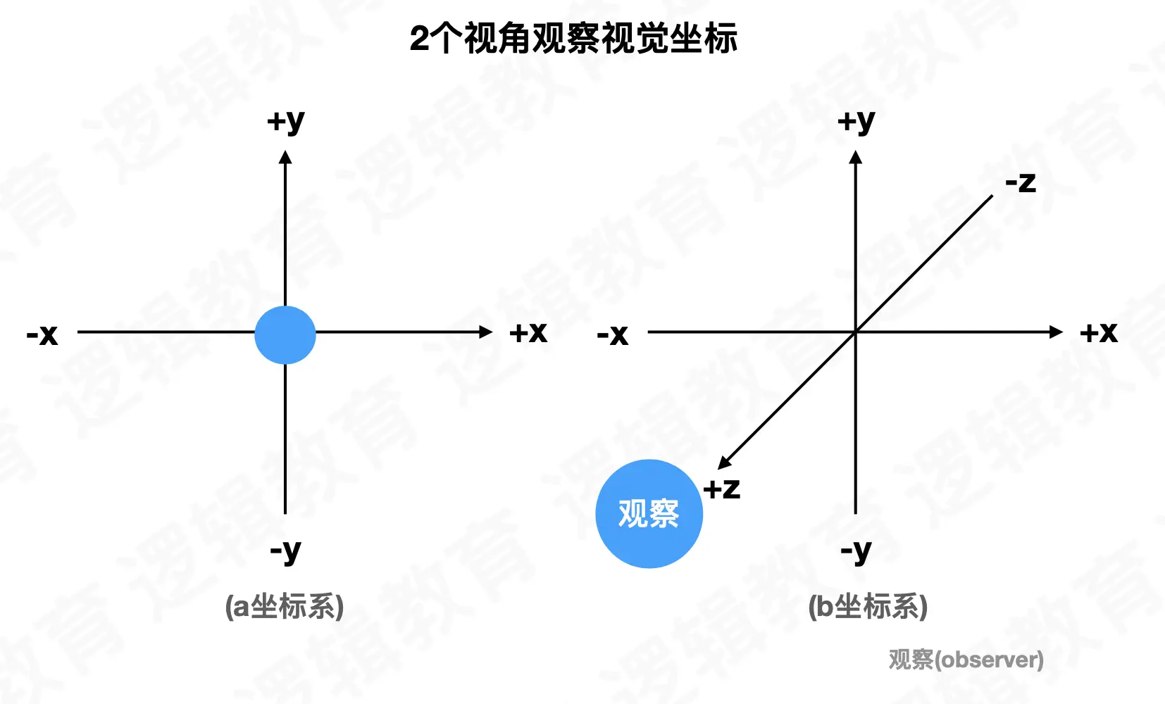 视图变换是应用到场景中的第一种变换, 它用来确定场景中的有利位置,在默认情况下, 透视 投影中位于原点(0,0,0),并沿着 z 轴负方向进行观察 (向显示器器内部”看过去”). 当观察者点位于原点(0,0,0) 时,就像在透视投影中一样. 视图变换将观察者放在你希望的任何位置.并允许在任何方向上观察场景, 确定视图变换就像在场景中放置观察者并让它指向某⼀个⽅向; 从⼤局上考虑, 在应用任何其他模型变换之前, 必须先应用视图变换. 这样做是因为, 对于视觉坐标系⽽言, 视图变换移动了当前的⼯作的坐标系; 后续的变化都会基于新调整的坐标系进行.