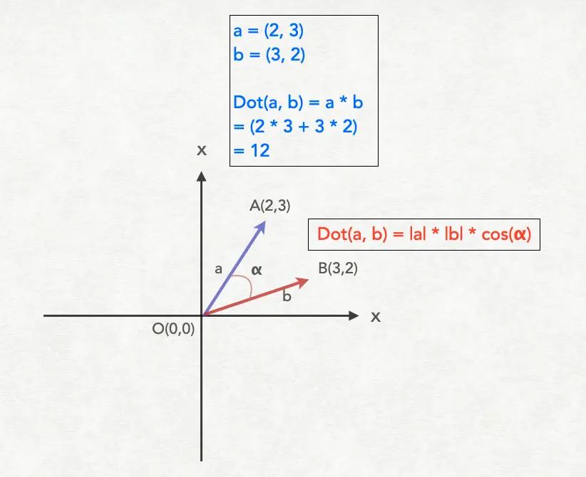 接下来通过一张图来一起看看向量的点积计算: