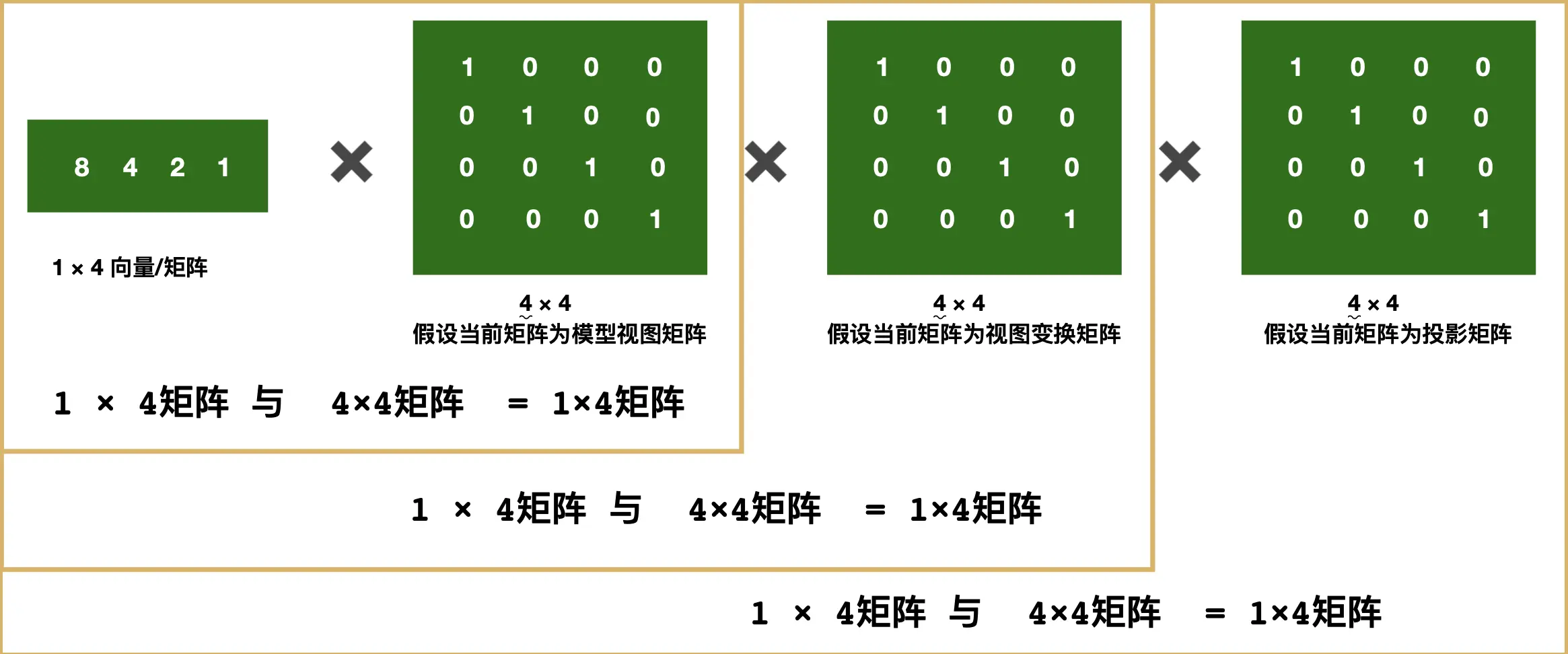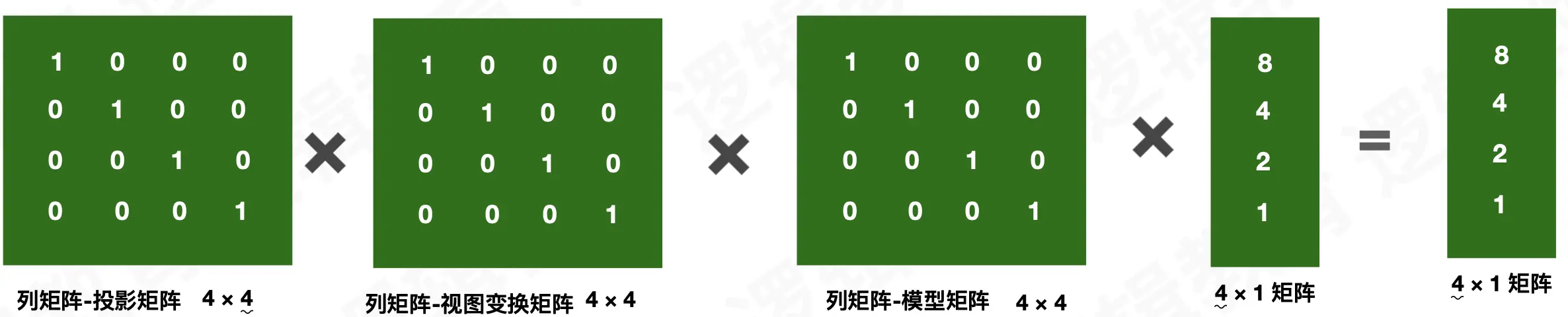 变换顶点向量 = 投影矩阵 ✖ 视图变换矩阵 ✖ 模型矩阵 ✖ 顶点